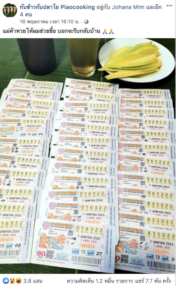 คอมเม้นท์ถึงกับสั่นสะเทือน เมื่อเฟซบุ๊กเพจ “กับข้าวกับปลาโอ Plaocooking” ที่เป็นเพจสอนทำอาหาร โพสต์ภาพสลากกินแบ่งรัฐบาล เป็นสลากเลขที่ลงท้ายด้วย 22 หลายใบ ของงวดวันที่ 1 เมษายน 2563 ที่ออกรางวันใน วันที่ 16 พฤษภาคม 2563 พร้อมระบุข้อความว่า