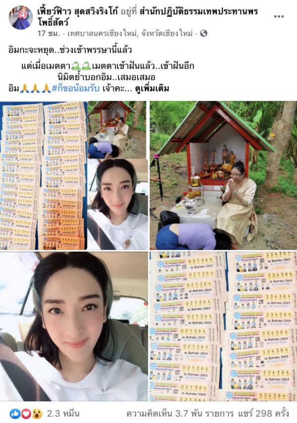 ถูกหวยอีกแล้วจ้า จะใครล่ะคะ ก็นักแสดงสาว อารมณ์ดี เฟี้ยว์ฟ้าว สุดสวิงริงโก้ ที่ล่าสุด เฮงแล้ว เฮงอีก ถูกหวย รางวัลผลสลากกินแบ่งงวดวันที่ 16 สิงหาคม 2563 ที่ผ่านมา โดยเจ้าตัวได้โพสภาพ ลอตเตอรี่ที่ถูกรางวัล บนเฟซบุ๊กส่วนตัว ซึ่งเป็นเลขท้าย 3 ตัว เลข 364 นับ ๆ ดูแล้ว ก็เป็นจำนวนกว่า 30 ใบ เป็นจำนวนเงินกว่าแสนบาทเลยทีเดียว ซึ่งเฟี้ยว์ฟ้าว ยังได้โพสข้อความเพิ่มเติมอีกว่า