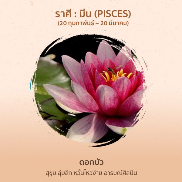 สัญลักษณ์ดอกบัว แสดงถึงความสุขุม ลุ่มลึก คุณเป็นคนที่ชอบซึมซับเอาจากสิ่งต่างๆ รอบด้าน และกลั่นมันออกมาเป็นไอเดีย และแรงบันดาลใจ บางครั้งคุณก็มีอารมณ์หวั่นไหว โอนเอียงไปตามคนอื่น แต่สุดท้ายนั่นก็ไม่ได้สั่นคลอนตัวตนที่ลุ่มลึกของคุณ คุณมีความเป็นศิลปินโดยธรรมชาติ ทำอาชีพที่เกี่ยวข้องกับการแสดง เช่น นักแสดง นักร้อง เป็นคนที่สื่อสารกับใครๆ ได้ดี และมีความสามารถทางด้านภาษา