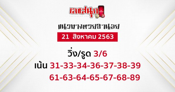 แนวทางเลขเด็ด แนวทางหวยฮานอย วันที่ 21/8/63 คือ เลข 31-33-34-36-37-38-39 / 61-63-64-65-67-68-89 สำหรับแนวทางเลขเด็ด หวยดัง หวยฮานอย หวยลาว หรือ แนวทางเลขสลากกินแบ่งรัฐบาล ที่ทางเว็บไซต์เลขสนุก นำมาเสนอให้กับเหล่านักเสี่ยงโชคทุกคนนั้น เป็นเพียงแค่แนวทางเลข ที่เรานำมาจากหลากหลายสำนักเท่านั้น การเลือกตัวเลขเพื่อนำไปเสี่ยงโชค ขึ้นอยู่กับการพิจารณาของแต่ละบุคคล และขอสนับสนุนให้เสี่ยงโชคกันอย่างถูกกฎหมาย