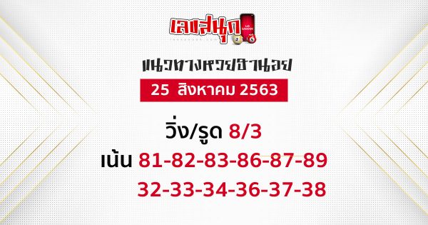 แนวทางเลขเด็ด แนวทางหวยฮานอย 25/8/63 คือ เลข 81-82-83-86-87-89 / 32-33-34-36-37-38 สำหรับแนวทางเลขเด็ด หวยดัง หวยฮานอย หวยลาว หรือ แนวทางเลขสลากกินแบ่งรัฐบาล ที่ทางเว็บไซต์เลขสนุก นำมาเสนอให้กับเหล่านักเสี่ยงโชคทุกคนนั้น เป็นเพียงแค่แนวทางเลข ที่เรานำมาจากหลากหลายสำนักเท่านั้น การเลือกตัวเลขเพื่อนำไปเสี่ยงโชค ขึ้นอยู่กับการพิจารณาของแต่ละบุคคล และขอสนับสนุนให้เสี่ยงโชคกันอย่างถูกกฎหมาย