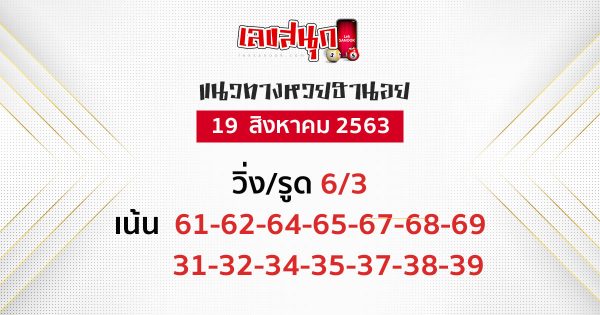แนวทางเลขเด็ด หวยฮานอย วันที่ 19/8/63 คือ เลข 61-62-64-65-67-68-69 / 31-32-34-35-37-38-39 สำหรับแนวทางเลขเด็ด หวยดัง หวยฮานอย หวยลาว หรือ แนวทางเลขสลากกินแบ่งรัฐบาล ที่ทางเว็บไซต์เลขสนุก นำมาเสนอให้กับเหล่านักเสี่ยงโชคทุกคนนั้น เป็นเพียงแค่แนวทางเลข ที่เรานำมาจากหลากหลายสำนักเท่านั้น การเลือกตัวเลขเพื่อนำไปเสี่ยงโชค ขึ้นอยู่กับการพิจารณาของแต่ละบุคคล และขอสนับสนุนให้เสี่ยงโชคกันอย่างถูกกฎหมาย