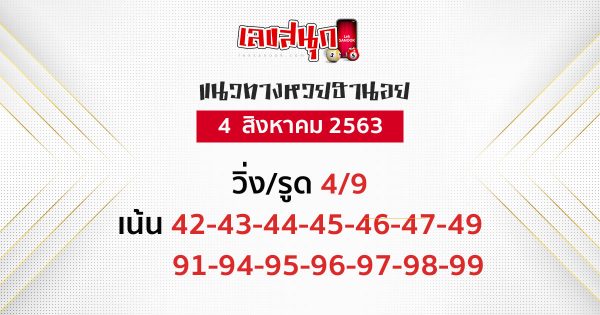 แนวทางเลขเด็ดหวยฮานอย วันที่ 4 ส.ค. 63 คือ เลข 42-43-44-45-46-47-49 / 91-94-95-96-97-98-99 สำหรับแนวทางเลขเด็ด หวยดัง หวยฮานอย หวยลาว หรือ แนวทางเลขสลากกินแบ่งรัฐบาล ที่ทางเว็บไซต์เลขสนุก นำมาเสนอให้กับเหล่านักเสี่ยงโชคทุกคนนั้น เป็นเพียงแค่แนวทางเลข ที่เรานำมาจากหลากหลายสำนักเท่านั้น การเลือกตัวเลขเพื่อนำไปเสี่ยงโชค ขึ้นอยู่กับการพิจารณาของแต่ละบุคคล และขอสนับสนุนให้เสี่ยงโชคกันอย่างถูกกฎหมาย