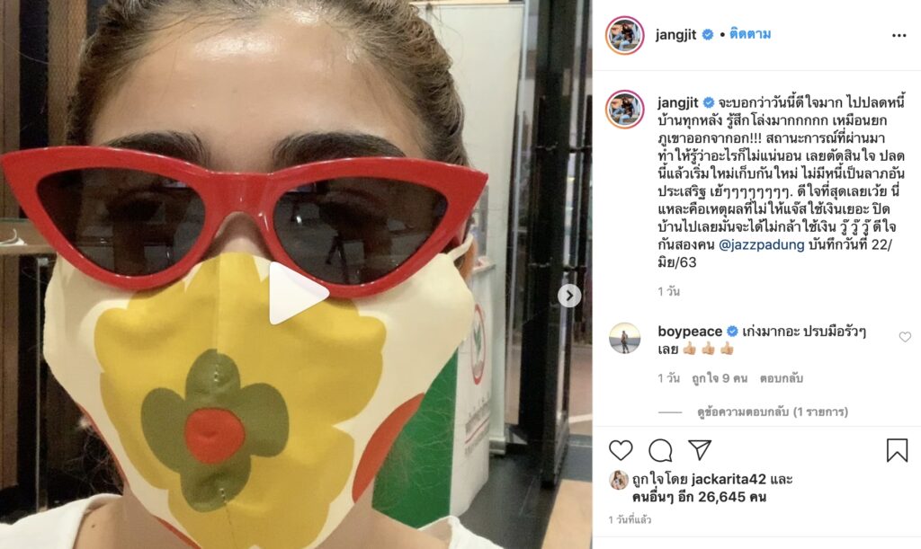 “จะบอกว่าวันนี้ดีใจมาก ไปปลดหนี้ บ้านทุกหลัง รู้สึกโล่งมากกกกก เหมือนยกภูเขาออกจากอก!!! สถานะการณ์ที่ผ่านมาทำให้รู้ว่าอะไรก็ไม่แน่นอน เลยตัดสินใจ ปลดนี้แล้วเริ่มใหม่เก็บกันใหม่ ไม่มีหนี้เป็นลาภอันประเสริฐ เย้ๆๆๆๆๆๆๆๆ. ดีใจที่สุดเลยเว้ย นี่แหละคือเหตุผลที่ไม่ให้แจ๊สใช้เงินเยอะ ปิดบ้านไปเลยมันจะได้ไม่กล้าใช้เงิน วู๊ วู๊ วู๊ ดีใจกันสองคน @jazzpadung บันทึกวันที่ 22/มิย/63″