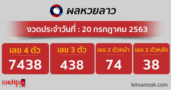 ขอแสดงความยินดีกับผู้ที่ถูกรางวัลผลหวยลาว วันที่ 20 ก.ค. 63 ได้แก่ เลข 4 ตัว : 7438 / 3 ตัว : 438 /2 ตัวหน้า : 74 / 2 ตัวหลัง : 38 สำหรับใครที่ไม่ถูกรางวัล ยังสามารถติดตามแนวทางเลขเด็ด หวยฮานอย หวยลาว สลากกินแบ่งรัฐบาล รวมถึงตรวจผลหวยฮานอย หวยลาว สลากกินแบ่งรัฐบาลได้ ในงวดต่อ ๆ ไป ผ่านทางเว็บไซต์เลขสนุก และขอสนับสนุนให้เสี่ยงโชคกันอย่างถูกกฎหมายนะคะ