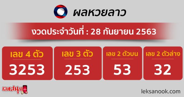 ขอแสดงความยินดีกับผู้ที่ถูกรางวัลผลหวยลาว วันที่ 28 ก.ย. 63 ได้แก่ เลข 4 ตัว : 3253 / 3 ตัว : 253 /2 ตัวบน : 53 / 2 ตัวล่าง : 32 สำหรับใครที่ไม่ถูกรางวัล ยังสามารถติดตามแนวทางเลขเด็ด หวยฮานอย หวยลาว สลากกินแบ่งรัฐบาล รวมถึงตรวจผลหวยฮานอย หวยลาว สลากกินแบ่งรัฐบาลได้ ในงวดต่อ ๆ ไป ผ่านทางเว็บไซต์เลขสนุก และขอสนับสนุนให้เสี่ยงโชคกันอย่างถูกกฎหมายนะคะ