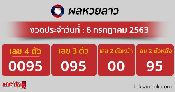 ขอแสดงความยินดีกับผู้ที่ถูกรางวัลผลหวยลาว วันที่ 6 ก.ค. 63 ได้แก่ เลข 4 ตัว : 0095 / 3 ตัว : 095 /2 ตัวหน้า : 00 / 2 ตัวหลัง : 95 สำหรับใครที่ไม่ถูกรางวัล ยังสามารถติดตามแนวทางเลขเด็ด หวยฮานอย หวยลาว สลากกินแบ่งรัฐบาล รวมถึงตรวจผลหวยฮานอย หวยลาว สลากกินแบ่งรัฐบาลได้ ในงวดต่อ ๆ ไป ผ่านทางเว็บไซต์เลขสนุก และขอสนับสนุนให้เสี่ยงโชคกันอย่างถูกกฎหมายนะคะ