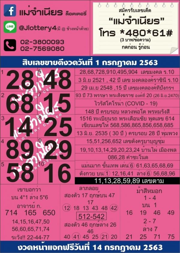 แนวทางเลขเด็ด เลขเจาะใจลุงหวัง งวดวันที่ 1/07/63 ได้แก่