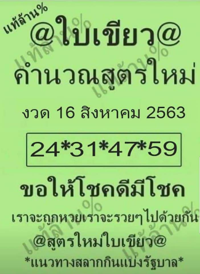 แนวทางเลขเด็ด โค้งสุดท้าย หวยงวด 16/8/63 จาก 10 สำนักหวยดัง แนวทางเลขสลากกินแบ่งรัฐบาล ที่ทางเว็บไซต์เลขสนุกนำมาเสนอให้กับเหล่านักเสี่ยงโชคทุกคนนั้นเป็นเพียงแค่แนวทางเลข ที่เรานำมาจากหลากหลายสำนักเท่านั้น การเลือกตัวเลขเพื่อนำไปเสี่ยงโชค ขึ้นอยู่กับการพิจารณาของแต่ละบุคคล และขอสนับสนุนให้เสี่ยงโชคกันอย่างถูกกฎหมายค่ะ
