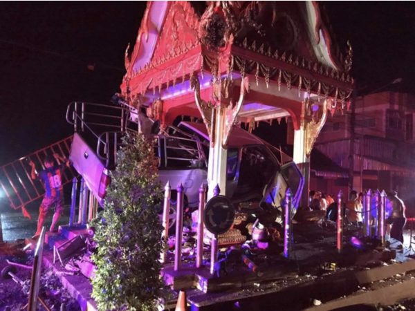 กระบะซิ่ง ฝ่าสายฝน เสียหลัก พุ่งชนศาลหลักเมือง ลำทะเมนชัย จังหวัดนครราชสีมา คอหวยไม่พลาด แห่ส่องเลขทะเบียนรถ หวังลุ้นรวยงวดต่อไป