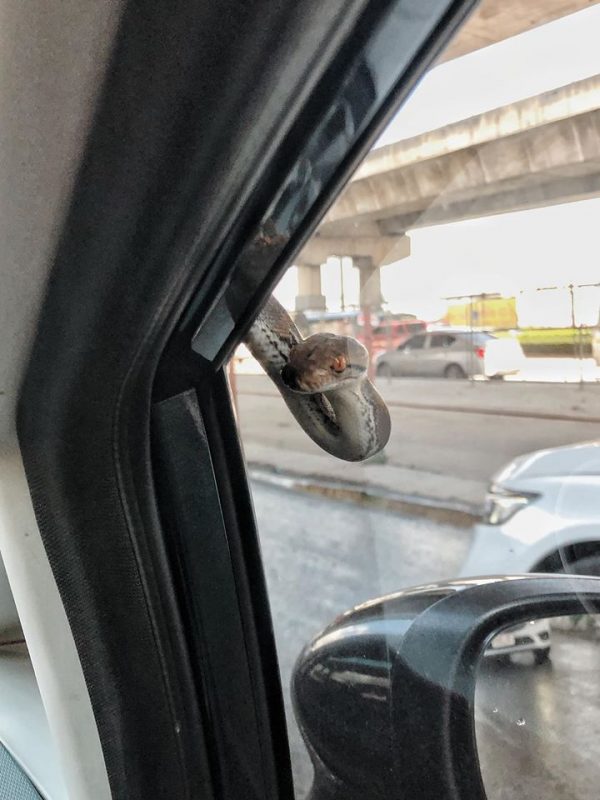 มีผู้ใช้เฟซบุ๊กที่ใช้ชื่อว่า Wassamon Sivapornpun ได้แชร์เรื่องราวระทึก ต้อนรับเช้าวันไปทำงาน โดยขณะที่เจ้าตัวกำลังขับรถอยู่ ก็ต้องถึงกับผงะสุดขีด เพราะเจอลูกงูเหลือม เลื้อยมาจ้องหน้า ตรงบริเวณกระจกฝั่งคนขับ ซึ่งเธอได้เล่าเรื่องราวไว้ในแคปชั่นว่า