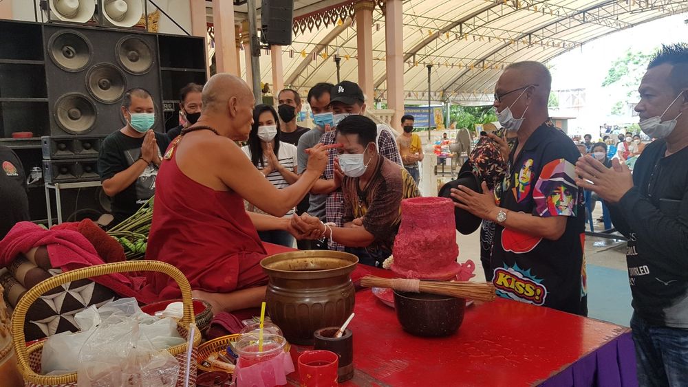 เมื่อคณะเดินทางมาถึงได้เข้ากราบไหว้หลวงพ่อแป๊ะ ขณะกำลังประกอบพิธีถวายสังฆทานให้กับสาธุชน พร้อมกับร่วมถวายสังฆทาน เมื่อเสร็จพิธีหลวงพ่อแป๊ะได้ให้เสี่ยชัช นำฝักบัวที่วัดปลูกมาแจกจ่ายให้กับสาธุชนที่มาประกอบพิธีทุกคน เสี่ยชัช และ นายสมบัติ หุ้นส่วนยังได้ถวายปัจจัยทำบุญให้หลวงพ่อแป๊ะ พร้อมกับหลวงพ่อแป๊ะ ได้นำสายสิญจน์พร้อมกับธนบัตรขวัญถุงมาผูกข้อมือ และประพรมน้ำมนต์ให้ ก่อนที่เสี่ยชัชและคณะร่วมทำบุญซื้อโลงศพถวายวัดด้วย เพื่อเป็นการสะเดาะเคราะห์