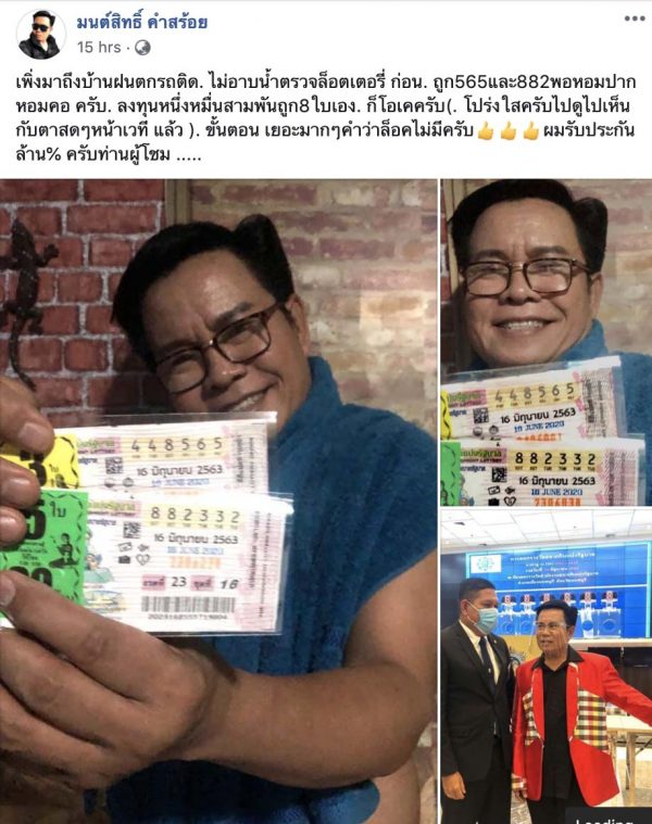 เริ่มที่คนแรกเลย คงหนีไม่พ้น เจ้าพ่อใบ้หวยคนดัง มนต์สิทธิ์ คำสร้อย ที่นอกจากจะเป็นนักร้องลูกทุ่ง เจ้าของเพลงฮิตแล้ว หลัง ๆ มานี้ หลายคนต้องยกให้เป็นเจ้าพ่อแห่งวงการหวยอีกด้วยค่ะ เพราะดวงเฮง ถูกหวยแทบทุกงวด ซึ่งงวดวันที่ 16 มิถุนายน ที่ผ่านมา นักร้องดังก็ไม่พลาด ถูกรางวัล เลข 3 ตัว ไปเบา ๆ ซึ่งเจ้าตัวก็ได้โพสภาพ พร้อมข้อความผ่านเฟซบุ๊กส่วนตัวว่า