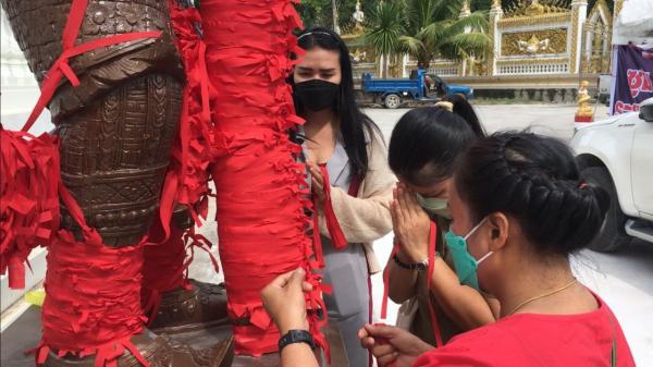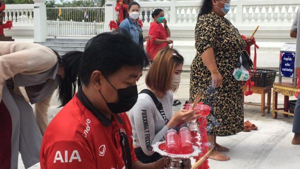 คอหวยพร้อมใจเดินทางมาแก้บนท้าวเวสสุวรรณ วัดหนองกรับ ตำบลหนองบัว อำเภอบ้านค่าย จังหวัดระยอง หลังได้โชคจากเลขฟุตบอลเสี่ยงทาย งวดที่ผ่านมา