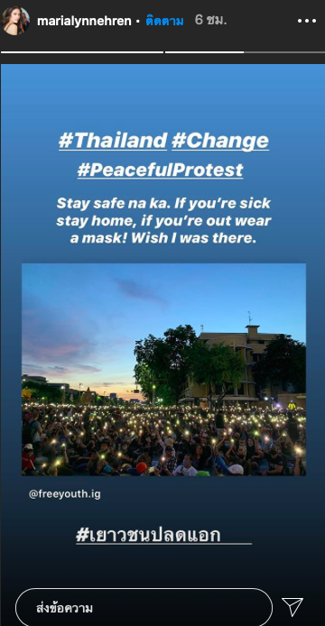 มารีญา พูลเลิศลาภ อดีตมิสยูนิเวิร์สไทยแลนด์ 2017 เคลื่อนไหวผ่านไอจีสตอรี่ ส่งกำลังใจให้กลุ่มเยาวชนปลดแอก