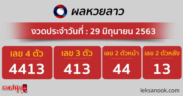 ขอแสดงความยินดีกับผู้ที่ถูกรางวัลผลหวยลาว วันที่ 29 มิ.ย.63 ได้แก่ เลข 4 ตัว : 4413 / 3 ตัว : 413 /2 ตัวบน : 13 / 2 ตัวล่าง : 44 สำหรับใครที่ไม่ถูกรางวัล ยังสามารถติดตามแนวทางเลขเด็ด หวยฮานอย หวยลาว สลากกินแบ่งรัฐบาล รวมถึงตรวจผลหวยฮานอย หวยลาว สลากกินแบ่งรัฐบาลได้ ในงวดต่อ ๆ ไป ผ่านทางเว็บไซต์เลขสนุก และขอสนับสนุนให้เสี่ยงโชคกันอย่างถูกกฎหมายนะคะ