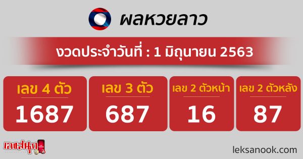 ขอแสดงความยินดีกับผู้ที่ถูกรางวัลหวยลาว วันที่ 1 มิ.ย. 63 ทุกท่านนะคะ สำหรับใครที่ไม่ถูกรางวัล ยังสามารถติดตามแนวทางเลขเด็ด หวยฮานอย หวยลาว สลากกินแบ่งรัฐบาล รวมถึงตรวจผลหวยฮานอย หวยลาว สลากกินแบ่งรัฐบาลได้ ในงวดต่อ ๆ ไป ผ่านทางเว็บไซต์เลขสนุก และขอสนับสนุนให้เสี่ยงโชคกันอย่างถูกกฎหมายนะคะ