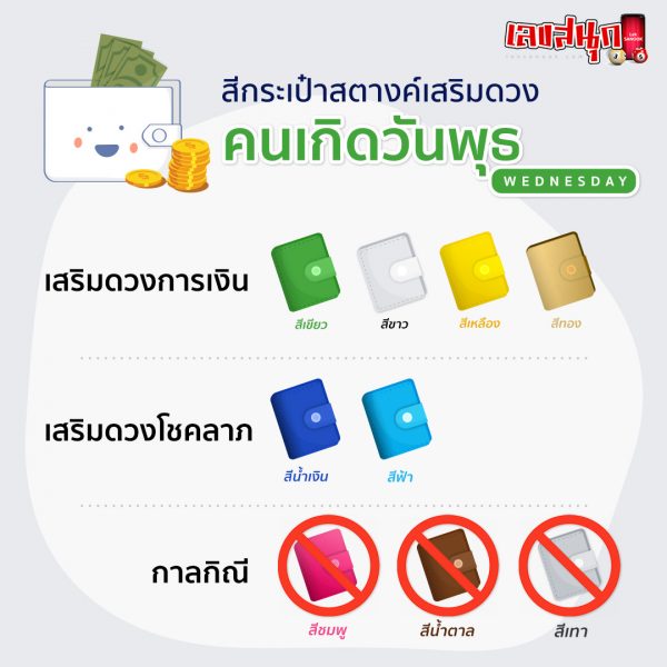 ?เสริมดวงการเงิน : คนเกิดวันพุธ ควรจะใช้กระเป๋าสตางค์ สีเขียว, สีขาว, สีเหลือง หรืออาจจะเป็นสีทอง ก็ได้เพราะสีเหล่านี้เป็นสีเรียกทรัพย์ของคนที่เกิดในวันพุธช่วยทำให้เงินทองไหลมาเทมาทำมาค้าขายอะไรก็ได้ดั่งใจมีโอกาสร่ำรวยๆ