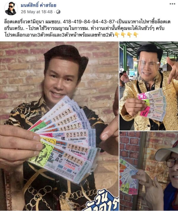 ถูกยกให้เป็น เจ้าพ่อใบ้หวยคนดังไปซะแล้ว สำหรับ นักร้องลูกทุ่งชื่อดังมนต์สิทธิ์ คำสร้อย ที่ดวงเฮง ถูกหวยแทบทุกงวด จนมีแฟนคลับเป็นเหล่าคอหวยเพิ่มขึ้นเยอะเลย แหม..มีทั้งแฟนเพลง และแฟนหวยเลยนะคะเนี่ย … ส่วนงวดล่าสุดที่กำลังจะมาถึง ซึ่งก็คือ หวยงวดวันที่ 1 มิถุนายนนี้ เจ้าตัวก็ไม่พลาดที่จะมาแบ่งปันความเฮง ให้คอหวยไปลองเสี่ยงโชค รวยตาม ๆ กันค่ะ … โดยมนต์สิทธิ์ ได้โพสภาพตัวเอง โชว์ลอตเตอรี่ในมือหลายชุดเหมือนเดิม พร้อมเลขเด็ด ๆ งวดนี้ และตามมาด้วยแคปชั่นว่า…