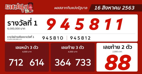 ตรวจหวย 16 สิงหาคม 2563 เว็บไซต์เลขสนุก ขอแสดงความยินดีกับผู้ที่ถูกรางวัลทุกท่านนะคะ สำหรับใครที่ไม่ถูกรางวัล ยังสามารถติดตามแนวทางเลขเด็ด สลากกินแบ่งรัฐบาล รวมถึงตรวจผลสลากกินแบ่งรัฐบาลได้ ในงวดต่อ ๆ ไป ผ่านทางเว็บไซต์เลขสนุก และขอสนับสนุนให้เสี่ยงโชคกันอย่างถูกกฎหมายนะคะ