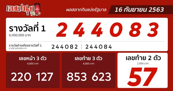ตรวจหวย 16 กันยายน 2563 เว็บไซต์เลขสนุก ขอแสดงความยินดีกับผู้ที่ถูกรางวัลทุกท่านนะคะ สำหรับใครที่ไม่ถูกรางวัล ยังสามารถติดตามแนวทางเลขเด็ด สลากกินแบ่งรัฐบาล รวมถึงตรวจผลสลากกินแบ่งรัฐบาลได้ ในงวดต่อ ๆ ไป ผ่านทางเว็บไซต์เลขสนุก และขอสนับสนุนให้เสี่ยงโชคกันอย่างถูกกฎหมายนะคะ
